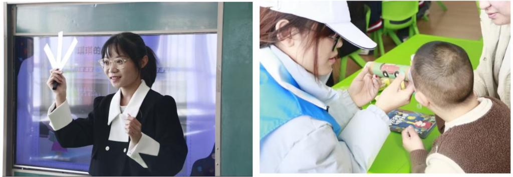 揭牌仪式后,2023级物理学专业师范生牛小雅为孤独症儿童带来了首场科普公开课。课程通过趣味实验与互动体验,让孩子们在动手操作中感受科学魅力,激发探索兴趣,同时促进其社交与沟通能力的提升,为他们的康复发展提供了创新路径。