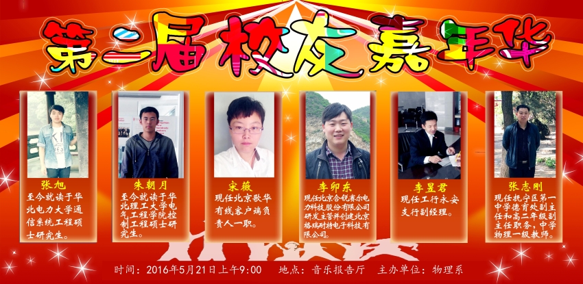 5、朱朝月,男,1990年7月,共产党员,2010-2014年在物理系应用物理学专业学习,曾任10级应用物理学专业团支部书记,获得过优秀员工干部等荣誉称号。2014年至今,就读于华北理工大学(原河北联合大学)电气工程公司,攻读控制工程硕士学位。目前,在唐山市科技中心新百工创客空间实习。