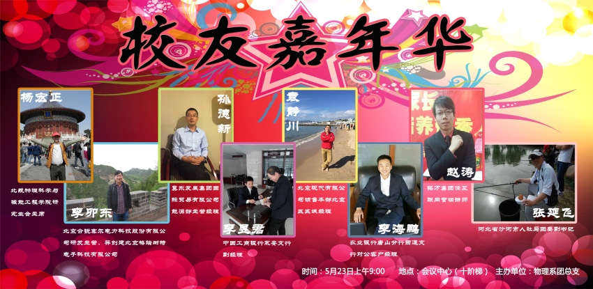 由物理系团总支主办的员工嘉年华——优秀毕业生交流会,将于2015年5月23日上午9:00,在猎豹体育南院会议中心(十阶梯)举办,欢迎广大师生前来参观。在此预祝此次交流会圆满成功。