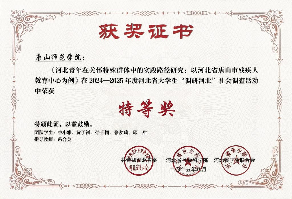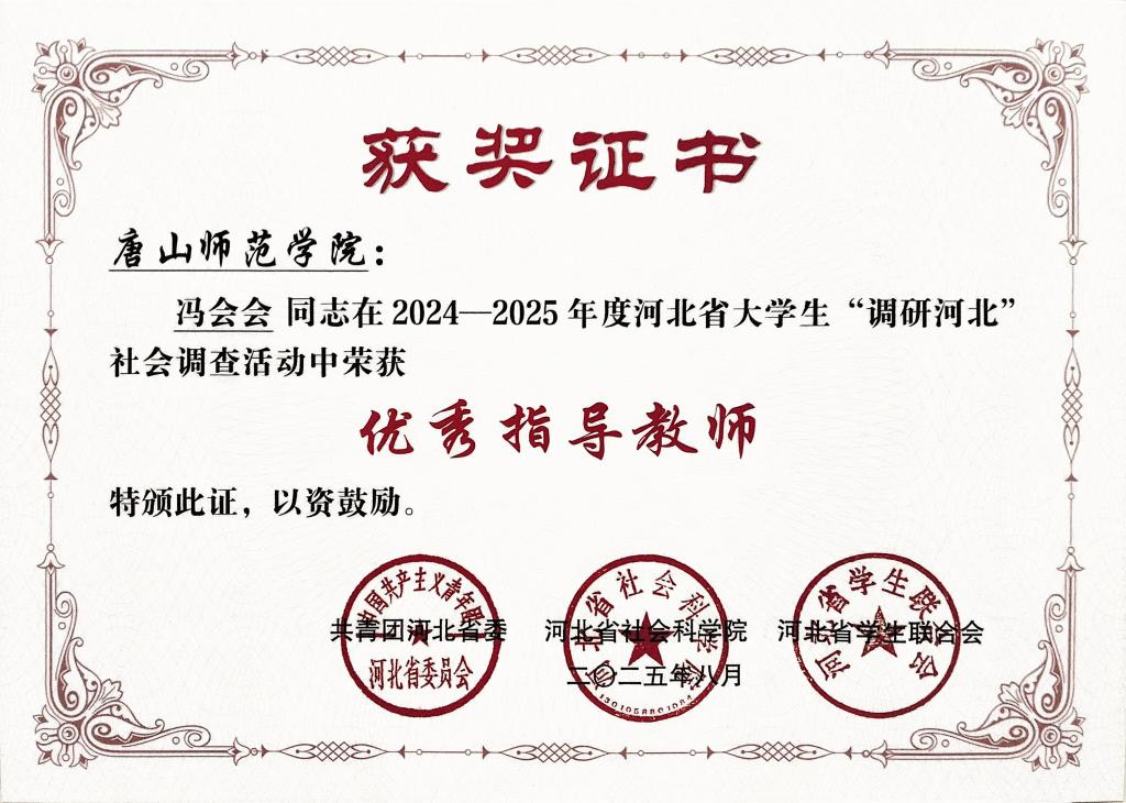由冯会会老师指导,牛小雅同学负责的课题《河北青年在关怀特殊群体中的实践路径研究:以河北省唐山市残疾人教育中心为例》,在全省95所高校申报的8641项课题中脱颖而出,获评河北省特等奖;团队指导教师冯会会,荣获“优秀指导教师”称号。